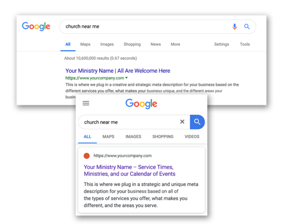 A comprehensive online marketing strategy for the Church or Ministry industry begins with organic search engine results. When someone in your area is searching for "Church or Ministry" you want to make sure you are an option. Our Church or Ministry SEO strategy will help increase your website rankings for important keywords in your market, increase website traffic, and increase phone call volume and form fills.