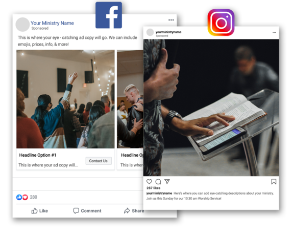 Utilizing Facebook’s advertising platform, we can tap into many different audiences of people on Facebook and Instagram. Social Media advertising has the unique ability to not only target the right Church or Ministry customer in the area of your choice, but it also allows social interaction between a customer and the Church or Ministry . People can comment, like, and share your post with other friends and family. Facebook also has the ability to use video and image ads to engage potential customers. Your customers are Facebook and Instagram, and we’ll use these platforms to reach them directly with your messaging.